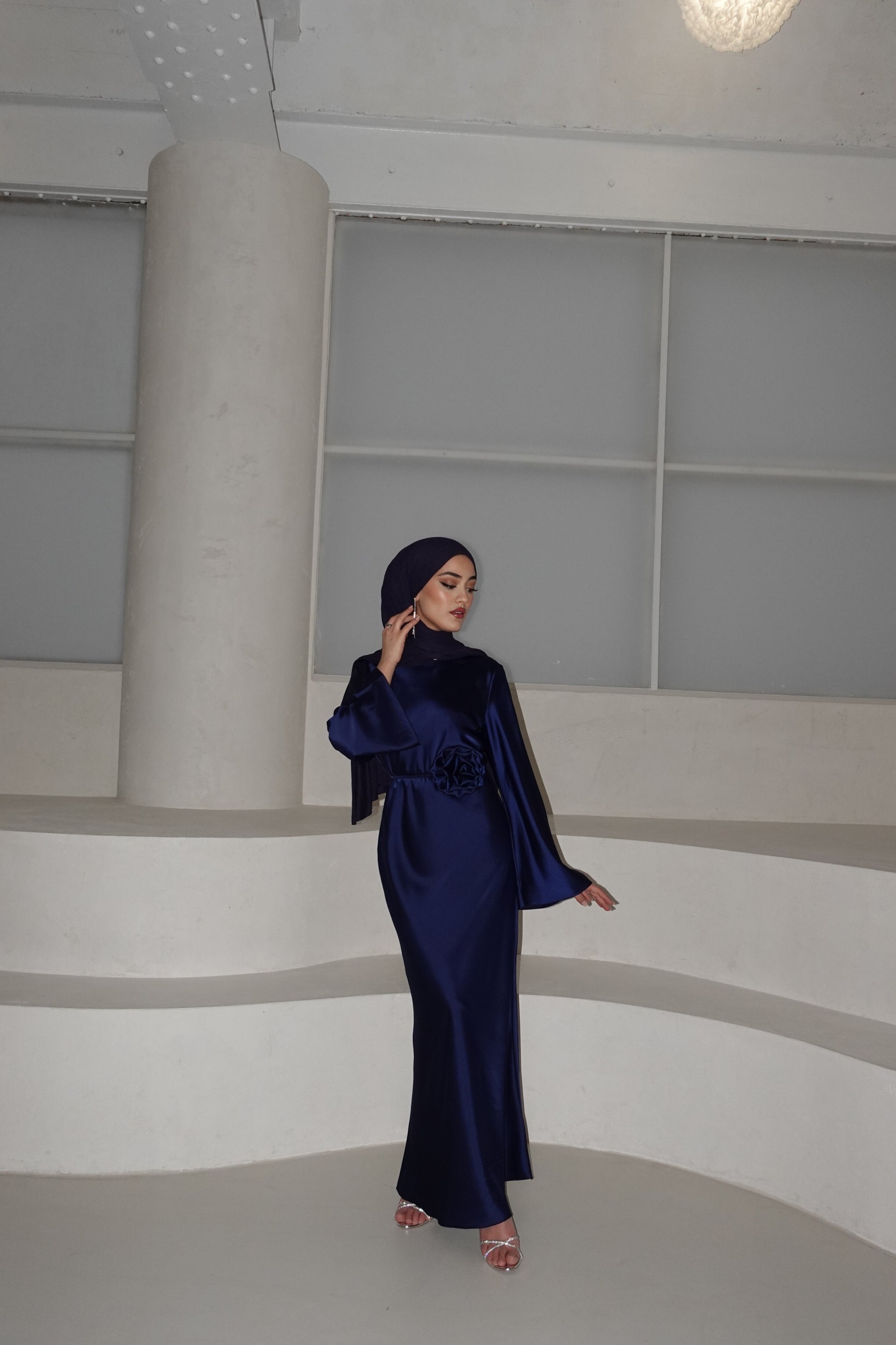 Dieses 140 cm lange Kleid vereint zeitlose Eleganz und modernen Stil. Der schimmernde Satin-Stoff und der romantische Blumengürtel betonen die Taille und verleihen eine feminine Note. Mit Größen von 36 bis 42 tragbar, bietet es perfekten Komfort für festliche Anlässe wie Hochzeiten, Eid oder Abendveranstaltungen. Ein Must-have für stilvolle Auftritte!